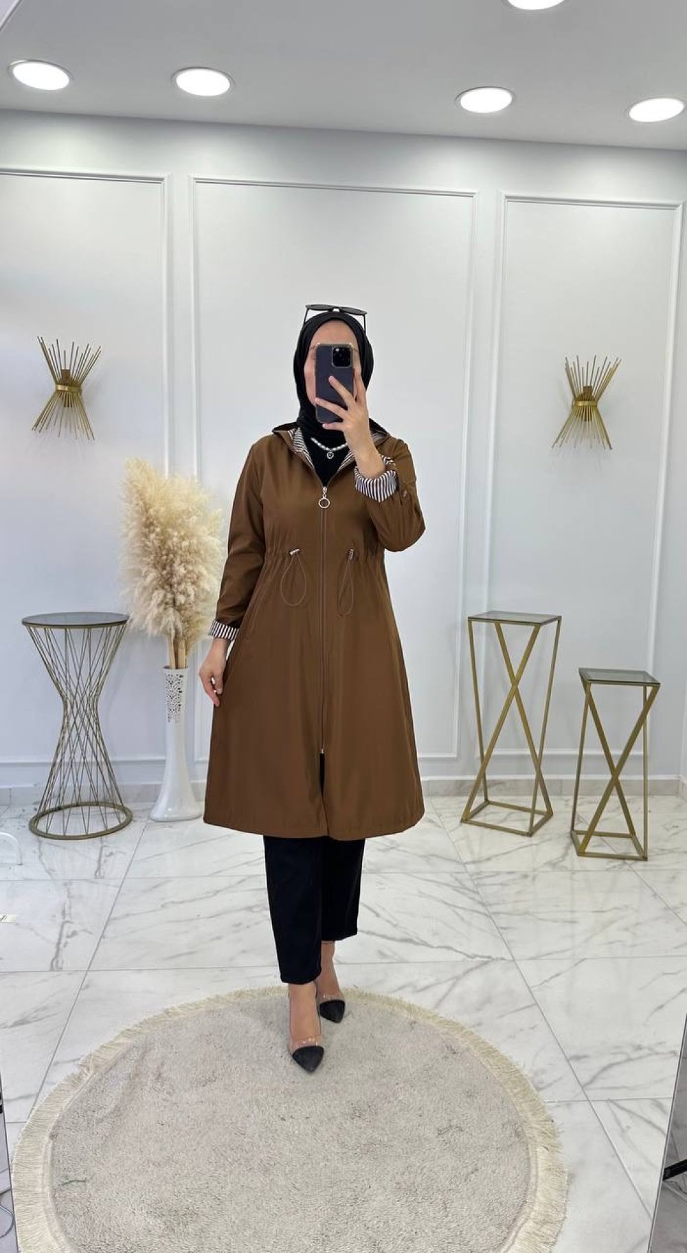 Çizgili astarlı, cepli, fermuarlı , bağcıklı, kapşonlu. Boy 105 cm