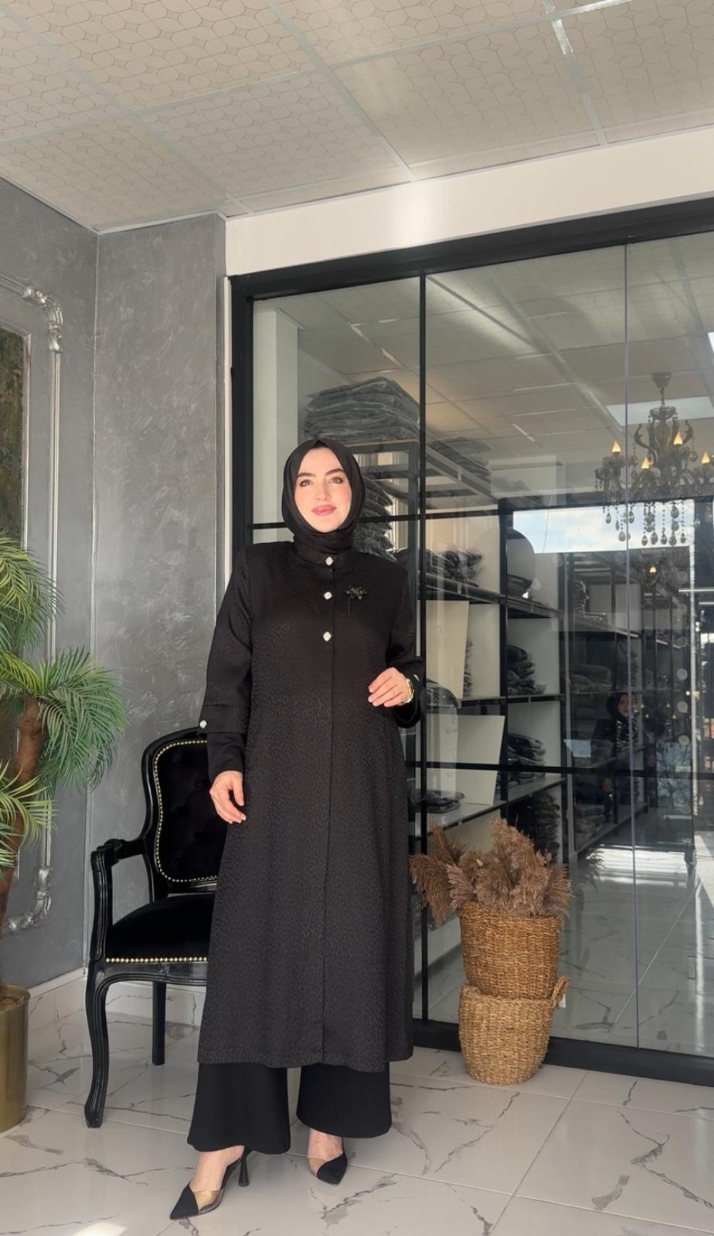 Kumaşı jakar satendir. Önü çıtçıt ve düğmelidir. Cepleri yoktur.