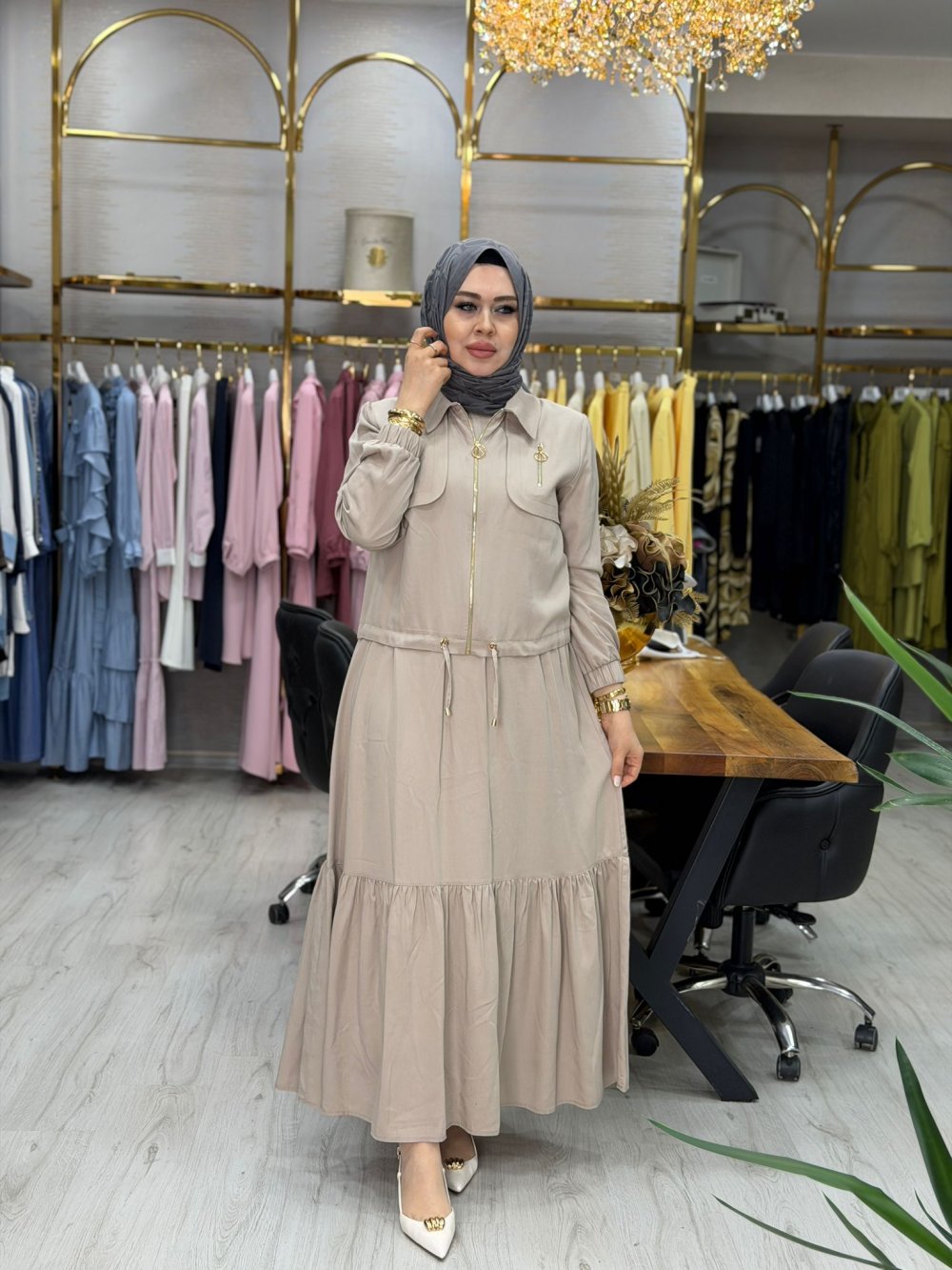 Elbisenin arkası yarım fermuarlıdır. Ceket önü fermuarlıdır.